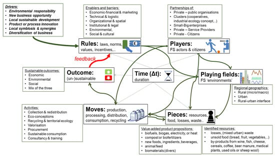 First, they reveal which enablers and barriers are hindering or accelerating factors. Then, they challenge the configurations of players, including various partnership models, which are seeking viable business cases, robustness and resilience while confronted with enablers and barriers. Since one is dealing with agrifood waste and the by-products of, in general, local resources, the business cases are directly related to their immediate playing field. This has direct consequences for which resources (the pieces) are becoming available and can be handled with new technologies and/or logistic schemes (the moves). It is at this step that new value product propositions arise, which feeds back to the pieces to be considered in circular bioeconomy approaches. Their functionalities and specificities define the outcomes. If they contribute to local sustainable development or eco-socio-friendly products that create economic value for a diversity of players, then the outcomes are contributing to the transition towards sustainable food and bioeconomy systems. In our set of case studies, the sustainable outcomes mentioned by the enterprises were again all positive. Nevertheless, if there are unforeseen trade-offs or any other negative consequences, the outcomes could be unsustainable.