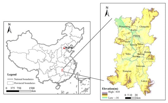 The CZX urban agglomeration, including parts of districts/counties of Changsha, Zhuzhou, and Xiangtan, is the core economic area of Hunan province (Figure 1), with a total economic volume of 1.79 trillion yuan. It is located in the eastern part of central Hunan province, and had a permanent population of 14.84 million in 2021. Its area is 1.89 × 104 km2, and the overall geographical condition of the vast area is that of low terrain which is suitable for urban spatial development. Currently, the CZX urban agglomeration is in the stage of rapid industrialization and urbanization which will continue in the future. The built-up area of the CZX urban agglomeration expanded by 2.72 times from the year 2000 to the year 2020, and the urban land increased by 1096.67 km2. The rapid urbanization process will inevitably drive land-use changes, thus causing the TECS change. Hence, it is important for those planning sustainable regional development to be able to estimate the TECS change caused by multi-scenario land-use change.