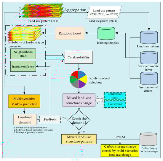 Framework for estimating carbon stock changes caused by land-use changes under multi-scenarios.