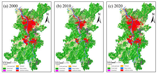 Our study divides the land-use types into six categories: cultivated land, forest land, grassland, wetland, water bodies, and artificial surfaces (also known as urban land). Using Matlab 2019 (b) software, the land-use type data of years 2000, 2010, and 2020 in the CZX urban agglomeration are aggregated into 300-m spatial resolution, and the proportion of each land-use type in each cell is obtained. With reference to previous research, the driving variables of the MCCA model are composed of a total of 13 spatial variables: population, GDP, distance to the city center, distance to the highway, distance to the main road, distance to the secondary road, DEM, slope, average annual rainfall, average annual temperature, soil oxygen content, soil fertility, and soil availability. The above spatial variables are resampled into 300-m spatial resolution data for normalization.