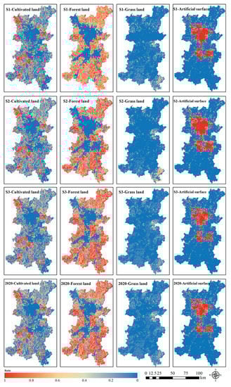 - Scenario 2: Cultivated land protection scenario (S2). Reducing the occupation of cultivated land caused by urban expansion is an important measure to ensure regional food security. Based on the S1 development scenario, this scenario uses the permanent basic cultivated land protection area as the restriction condition, and modifies the transition probability matrix in the MCM model. The probability of conversion from cultivated land to construction land is 40% of the S1 scenario, reducing the occupation of cultivated land by urban expansion and implementing cultivated land protection policies.