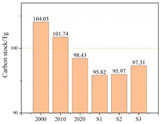 Carbon stock of different land-use types in the CZX urban agglomeration (2000, 2010, and 2020).