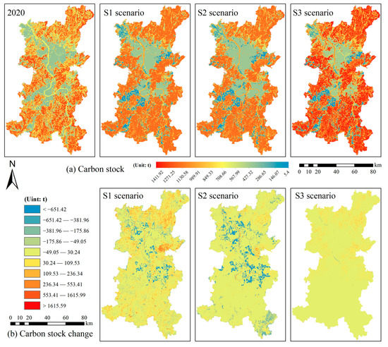 Carbon stock and its changes under three scenarios in the CZX urban agglomeration.
