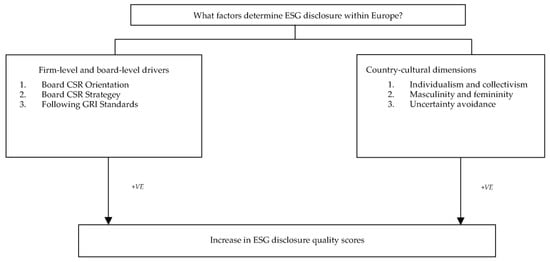It is undeniable that non-financial information produced by companies has gained an increasing interest in the research sphere of accounting and sustainability in recent years [1,2,3,4,5]. The reporting of this sustainability information is prepared through information on corporate social performance (CSP), sustainability strategy, and goals evaluated by ESG factors [6]. This increase in reporting of nonfinancial information originates from increased societal attention and demand on how firms operate, with society questioning how firm activities affect the environment [1,2,3,4,5]. This need for transparency from larger stakeholders leads to the need for comparable non-financial information to assess company sustainability performance [7]. The inclusion of sustainability reports includes information related to emissions, waste, human rights, and corporate governance factors that are not captured in financial reports [2,3,5]. Sustainability reports target a wider audience of users, from governments to investors, customers, suppliers, and employees [4]. ESG disclosure scores are practices that can be used to satisfy investors’ information needs requirements. At a firm level, an increased level of non-financial information mitigates risk and can increase corporate financial performance from risk mitigation due to the reduction of the cost of capital by disclosing more non-financial information [8]. As suggested by Ioannou and Serafeim, the disclosure of ESGs varies between firms and countries [9]. Therefore, this research will further this investigation to determine factors that affect ESG disclosure practices in Europe. Within the Europe region, European managers view ESG practices in a different way. Influenced by country-level factors such as cultural systems, the differences in ESG disclosure practices create an interesting discussion and analysis. The absence of the standardization of ESG reporting requires an investigation into why firms disclose ESG information and what factors play a mediating role in this disclosure [8].
