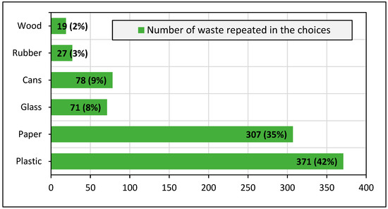 To investigate the most types of solid waste that are disposed of at Qassim University, a statement is devised to choose one or more of six waste types. The respondents are allowed to select one or multiple choices of the following solid waste: paper, plastic, glass, metal cans, wood, and leather. Some respondents (2.1%) selected all the available six choices, as presented in Table 9. The highest percentage selected by the participants was “paper and plastic” 41.5%, followed by plastic with a percentage of 20%, while the choice of disposing of only paper was the third-ranked (11%). The most individually selected type of solid waste was plastic with a percentage of 42%, followed by paper at 35%, and the third rank was glass at 8%, as illustrated in Figure 1. Based on these results, hypothesis number 5 cannot be accepted: “H5: The most disposed of solid waste in the university is paper”. Waste segregation and recycling programs should consider the amount ranking of solid waste types in QU.