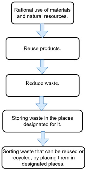 Solid waste is produced in QU from classrooms, faculty and staff offices, and cafeterias. The university converted to an electronic system in most procedures such as official documents, lecture notes, student reports, and so on. Only the student exams are still implemented using paper exams, therefore, paper is produced less currently than in the previous years, and most wastepaper is produced by faculty and staff offices, as presented in Table 10. Based on the discussion with the SDC members in QU, the waste paper and packaging cardboard are collected in the same containers together with other waste without any segregation. The quality of tap water in the university is not valid for drinking purposes, therefore, university stakeholders are depending mainly on the water in small bottles (0.33 L to 1.5 L). This is the reason that plastic waste is more than other waste components in QU. The degradation of plastic is very slow and may take hundreds of years, which affects the environment for a long period of time [20]. Thus, collecting plastic waste in an integrated program of waste management will protect the environment, recover its economic value, and preserve the resources from the production of new bottles. Article number eleven, chapter three of MWAN executive regulations recommended five processes that should be implemented by any waste producers, as given in Figure 2 [41]. Although the MWAN has specific regulations for all processes of waste management, there are no articles to enforce waste producers to apply waste segregation at the site. The QU is highly recommended to follow these procedures.