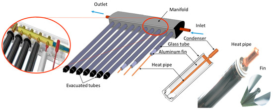 Ten evacuated glass tubes connected to a manifold form the heat pipe ETSC system, as seen in Figure 1. The evacuated tubes are made from low-emissivity borosilicate glass with 700 mm of length and 58 mm of outer diameter. Inside each evacuated tube is inserted a heat pipe of 650 mm in length and a 21 mm diameter. A copper pipe with a larger diameter bulb at one end makes up the heat pipe. Within the heat pipe is a small amount of high-purity liquid water that is heated and evaporated at a high temperature in the base of the pipe (the evaporator), and the heated vapor rises to the top of the pipe (the condenser). Heat is transferred from the vapor that has reached the condenser to the solar thermal collector manifold. The heat then travels via the manifold to the heat medium. The fluid in the heat pipe condenser then cools and returns to the heat pipe evaporator at the bottom. As long as thermal energy is available, this heating and condensation cycle will continue. The outside of the inner evacuated tube is covered by a solar selective coating, which is in contact with a circular aluminum fin. The selective covering absorbs the radiation, which is collected as thermal energy and transferred to the heat pipe via the aluminum fins. The heat pipes are connected to a manifold that contains flowing water. To greatly reduce heat losses, the manifold is completely insulated using foam insulation materials. Table 1 is a list of the geometric parameters of the ETSC system.