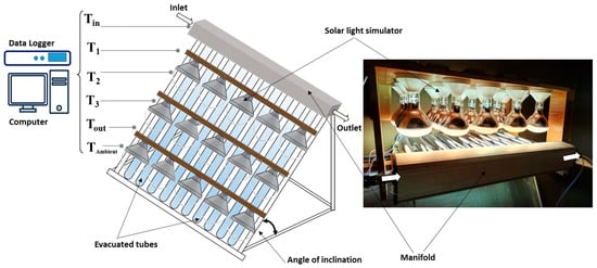 Experiments were carried out by placing the collector facing the solar light simulator (Figure 3). For evaluating and testing the ETSCs in a lab setting, the solar simulator has been employed as a controllable indoor test device. The sunlight simulator was built from an array of 15 iron base lamps, each with a maximum electrical power usage of 400 W and covering a 1 m2 area. K-type thermocouples with an accuracy of 0.5% were installed in the test setup to measure the ambient temperature under the solar simulator, the inlet and outlet water temperatures in the ETSC, and finally, the condenser temperature and the fin absorber temperature. Using a data recorder, all these experimental parameters were monitored and recorded. The recordings are all averaged across intervals of 2 s.