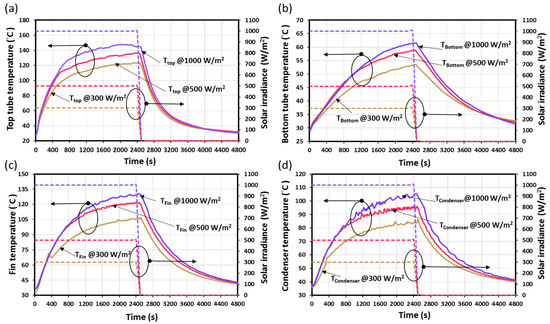 The effect of solar irradiance on (a) the glass tube top surface temperature, (b) the glass tube bottom temperature surface, (c) the fin aluminum surface temperature, and (d) the condenser surface temperature.