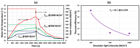 The effect of solar irradiance on (a) the outlet water temperature and (b) the thermal efficiency of the heat pipe ETSC system.