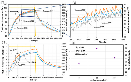 Experiments were carried out for various tilt angles of the collector (with constant solar irradiance of 1000 W/m2), and in every situation, an inlet water temperature of 22 °C was provided. The heat pipe ETSC system was exposed to the solar simulator with different tilt angles of 0°, 30°, and 90° from the horizon in order to investigate the impact of the inclination on the thermal efficiency of the ETSC system. Figure 6 illustrates the impact of the tilt angle on the condenser temperature, the outlet temperature, and the heat pipe ETSC system’s efficiency. In Figure 6a,b, it is evident that the wall condenser temperature fluctuates; this is due to the condensation phenomenon in the condenser, where the vapor releases its heat to the header. Then, the vapor condenses and returns to the evaporator, where it is heated again. As long as thermal energy is available, this heating (i.e., vaporization) and cooling (i.e., condensation) cycle will continue; hence, a fluctuation of the condenser wall temperature happens, as seen in Figure 6b.