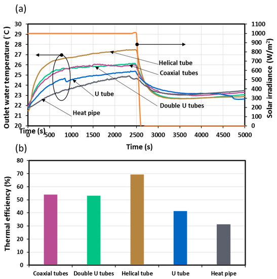 Four single ETSC configurations were tested under identical experimental conditions in order to assess the ETSC’s effectiveness in accordance with the design of the direct-flow ETSC type. Experiments were carried out for different ETSC configurations with constant solar irradiance (1000 W/m2), and in every situation, an inlet water temperature of 22 °C was provided. The ETSC’s performance was analyzed based on the inlet and outlet temperature differential’s fluctuation. A comparison between two types of ETSC is studied in this part of the article; the heat pipe ETSC and the direct-flow ETSC, as presented in Figure 8. This depicts the change in the outflow water’s temperature over time for five types of heat exchangers: (1) Heat pipe; (2) U-tube; (3) Double U-tube; (4) Coaxial tube; and (5) Helical tube. By using a single evacuated tube for each case and during the 2400 s results show (Figure 8a) that for the helical tube, the outlet temperature rises to a maximum of 27.5 °C, while for the coaxial tube, double U-pipe, and U-tube ETSC heat exchangers, the outlet temperatures reach 26.1 °C, 26 °C, and 25.4 °C, respectively. Furthermore, the ETSC heat pipes attained a maximum temperature of 24.8 °C. Temperatures then begin to drop as soon as the collectors stop receiving solar irradiation, reaching 23.5 °C, 23.4 °C, 23.3 °C, 23 °C, and 22.8 °C for heat pipe, double U-tubes, coaxial tubes, helical tube, and U-tube, respectively. It is concluded that an ETSC with a helical tube can provide hot water at a higher temperature than a typical heat pipe ETSC.