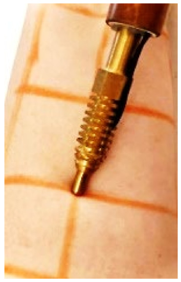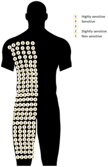 The first objective of the current research was to determine the thermal sensitivity map of the human body. To this end, a special thermo probe was developed with a circular contact surface and a diameter of 5 mm. The design and testing of the probe have been thoroughly presented in [49]. To ensure a controlled environment (24 ± 1 °C and 50 ± 5.5% RH), the tests were performed in a climatic chamber, where each of the subjects was placed for 15 min before the thermal sensitivity test. For a better analysis of the data, the thermal vote sensation, the activities performed by the subjects in the hours preceding the test, as well as other information have been recorded in a questionnaire. The next step was an accommodation phase with the probe-skin contact (Figure 1). For the tests, the authors used a starting neutral base temperature of 32 ± 0.5 °C and a spot stimulus of +8 °C. After holding the thermal probe in place for 10 s, the thermal sensation scores of the volunteers were recorded to form a thermal sensitivity map such as the one presented in Figure 2.