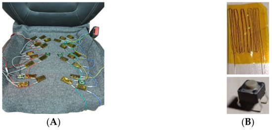 Car seat used in experiments (A) Positioning of the heating resistances (B) An example of a heating resistance and a pressure switch used for the experimental setup.