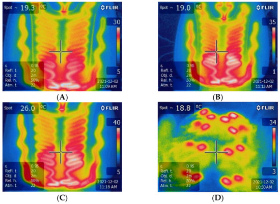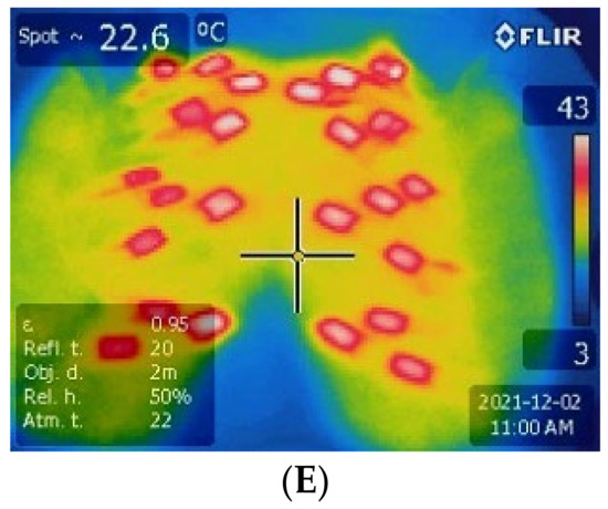 The monitoring duration varied between 10 and 15 min, which was the time required to reach a constant temperature (no significant changes over a period of 1 min) of the seat (thermal equilibrium). Figure 6A–E were captured after reaching thermal equilibrium. After installing the heating elements on the seat and checking the proper operation of the circuit, the seat was allowed to cool to room temperature (15 ± 1 °C) before being tested. As for the reference heating system, the monitored parameters were the power consumption and the temperature distribution map.