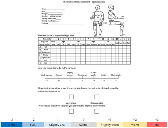To verify the study hypothesis, a human subjectivity measurement campaign was performed. For this, eight human subjects of different ages and genders were asked to be seated (while the heating systems were turned on) and to appreciate the thermal sensation based on the scale and on the questionnaire presented in Figure 7. The number of subjects respects the minimum prescriptions indicated by the ISO 14505-2 standard which specifies that the minimum sample of subjects for in-cabin environment evaluation is 8.