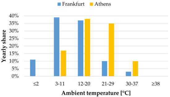 - climate and driving data over 1 year for 2 European cities (Frankfurt—colder climate and Athens—warmer climate)—presented in Figure 8 and Table 5;