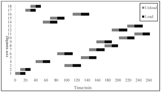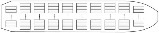 Equation (1) indicates the objective function. Within each bay, the total quay crane operation time is the time for the quay crane to complete the last container operation. Optimizing the sequence of loading and unloading in the bay is to minimize the loading and unloading operation time. Considering that the total quay crane operation time is the time for the quay crane to complete the last container operation, which could be presented by the maximum of the loading time for the last container. Therefore, the objective function becomes a min–max form, as shown by Equation (1).