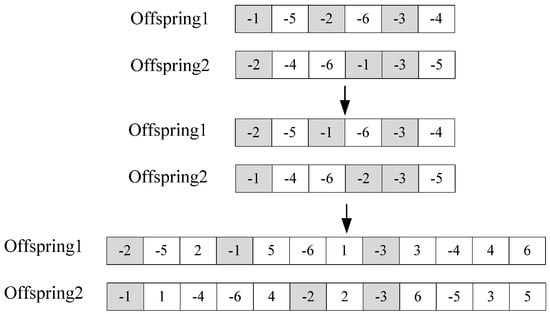 The chromosomes in the population were crossed as follows. Select any two chromosomes, remove the loading column from the chromosome, select any same n row (n is selected according to the number of row s to be unloaded) from the two chromosomes, cross copy the n row in the two chromosomes, and obtain two new chromosomes without loading row. Then, according to the chromosome coding method, the loading sequence is added to the newly generated chromosome. The crossover method is shown in Figure 5: first, select −1, −2, −3 of the two chromosomes for crossover, and then add the loading row after the row of the newly generated offspring.
