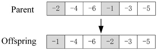 The chromosome was mutated as follows. Choose any two unloading positions of chromosome to exchange their positions. If each container is unloaded first and then loaded, the chromosome is feasible. If a container is loaded first and then unloaded, the chromosome of the unloading position in the mutated chromosome is adjusted to ensure that each container is unloaded first and then loaded. The crossover method is shown in Figure 6.