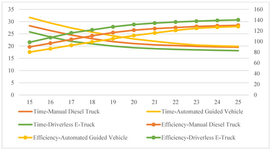 Where Cci is the purchase cost of vehicles with different kinds of transportation equipment, yuan, when i = 1 is manually driven diesel truck, i = 2 is AGV, i = 3 is DET; Cbi is the cost of purchasing different kinds of vehicle, yuan; ri is the residual value rate of the vehicle after the end of the depreciation period, %; ni is the depreciation period of the vehicle, year; Ti is the transport time, h; Cti is the vehicle purchase tax for different kinds of vehicles, yuan; Cii is the vehicle insurance premium for different kinds of vehicles, yuan; cii1 is compulsory insurance for motor vehicle accident liability, yuan; cii2 is the vehicle loss insurance, yuan; Csi is the labor cost when using different kinds of vehicles, yuan; is the average annual salary of the driver/operator, yuan; Cfi is the cost of fuel consumed by different kinds of vehicles, yuan; fi is fuel consumption; is the average price per unit of fuel; Cwi is the maintenance fee for different kinds of vehicles, yuan; LRi is transport distance, km; Lwi is the rated distance for corresponding maintenance work, km; is the average cost of each repair and maintenance, yuan; Cli is the tire wear and tear costs of different levels of transportation equipment, yuan; nli is the number of tires of different kinds of vehicles; is the average price of a tire; Lli is the distance that the tire can travel during its life, km.