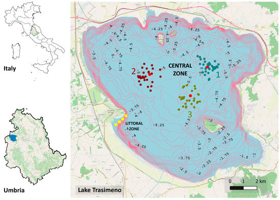 Map of the study area (Lake Trasimeno, Central Italy); pink lines indicate isobaths (numbers indicate water depth every 0.25 m). Central zone sampling area: three sampling sites, dots indicate each sampling occasion; red dots indicate the centres of each sampling site; squares indicate littoral zone sampling areas.