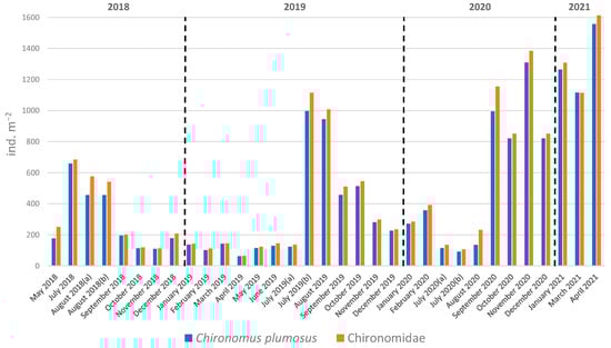 Densities of Chironomus plumosus and total Chironomidae in the 33 sampling occasions carried out at the central zone of Lake Trasimeno (2018–2021).