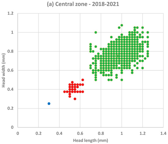 Biometries of the C. plumosus population, consisting of 9264 identified larvae, showed the almost exclusive presence of mature larvae (instar IV, 99.26%). Only 0.73% were instar III larvae (68 individuals, concentrated in August and September 2020, with 23 and 16 specimens, respectively), and 0.01% were instar II larvae (Figure 4a).