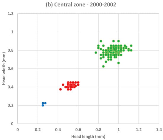 Lastly, the distribution between the larval stages of C. plumosus showed in 2000–2002 a lesser presence of mature larvae (instar IV, 85.44 vs. 99.26%) to the advantage of instar III larvae (13.76 vs. 0.73%), while the share of instar II larvae remained minimal (0.80 vs. 0.01%) (Figure 4b). This condition is probably related to the tendency of C. plumosus II and III instar larvae to colonise the deeper layers of the sediments when they have a high content of poorly stabilised silt, also due to the absence of vegetation [35,36,38]. In fact, the sampling technique used allows the air dredge sampler to reach a maximum depth of about 10 cm.