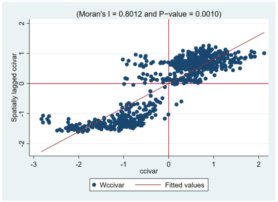 Before conducting the spatial econometric analysis, the core explanatory variables needed to be tested for spatial autocorrelation. Spatial autocorrelation of the variables was measured using Moran scatter plots of panel data, and the results are shown in Figure 2, Figure 3 and Figure 4. Both CCIs clusters and regional economic resilience have significant spatial characteristics, which allows the subsequent spatial simultaneous equations model estimation to be carried out.
