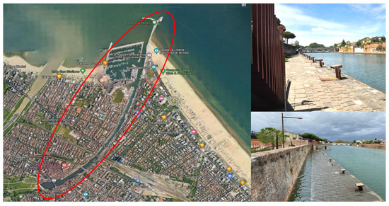 Our analysis began with on-site inspections to assess the urban and territorial system of the Canal of the Port of Rimini in Italy, illustrated in Figure 1, to identify deficiencies in terms of services, connections, availability of spaces, cycle-pedestrian paths, and carriageable roads [1]. This analysis led us to identify needs to support the functionality of the port as a whole, on the basis of which various alternative project scenario were proposed for the urban redevelopment of the Canal Port.