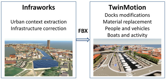 The model created in InfraWorks was exported as an .FBX file and imported into TwinMotion after being rendered in the software. The workflow of the construction of the virtual scene is illustrated in Figure 3.