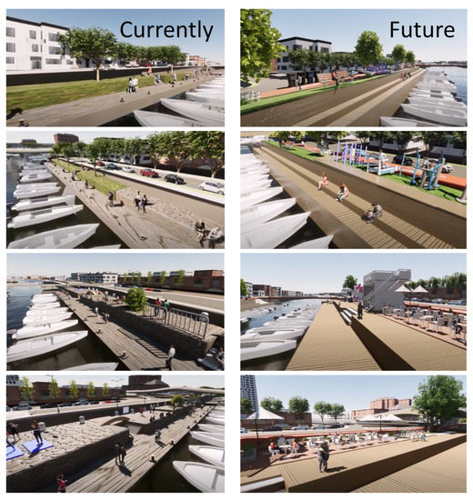Following this work, architectural solutions were proposed in [2] that represent targeted and specific interventions designed precisely for the context to which they are dedicated in order to make the Port’s canal area a continuum with its urban context and to improve its perception by tourists and inhabitants. These propositions were based on the knowledge of architectural experts. Therefore, while these two studies [1,2] provided an analysis and solutions based on socioeconomic, environmental, and architectural aspects and knowledge, their proposals need to be validated. The contribution of this paper is to provide a methodology to compare two scenarios, namely, before and after modification of the area, using virtual scenes.