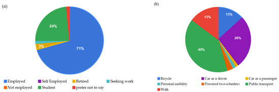 The questionnaire was proposed online for three weeks. A set of answers from N = 68 participants was collected. The sample was roughly half male and half female, with ages between 22 to 66 years old (M = 36.52, SD = 12.99). As shown in Figure 5a, a quarter of the respondents were students and three-quarters were personnel from the two universities, either professors or researchers. As for the main transportation modes, public transportation was the main mode and was used by 40% of the respondents, as illustrated by Figure 5b; 25% generally used a private vehicle, while a third of the participants used soft transportation, which was equally split between walking and bicycling.