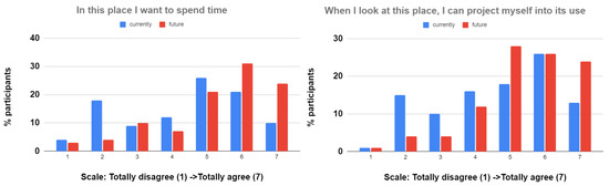 The respondents considered the atmosphere to be more pleasant in the renovated place, at 71% against only 57% in the current version of the docks. This is a favorable element for the proposed modification, as the general ambiance of the current version of the docks has been deemed gloomy [2]. As for the presence of vegetation, the improvement is clear, with 60% of participants feeling that there is not enough green space in the current docks, while agreement with this statement decreased to 40% for the future scene. Nonetheless, only 43% felt that there was enough vegetation in the future scenario, which is an element that can be improved.