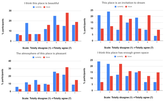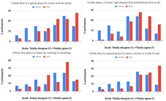When the respondents were asked to state their opinion about “I think this place is ideal for resting or strolling”, 61% of them agreed with the statement in the current situation, while 65% preferred the future infrastructure, showing less difference on this aspect. This result shows that water is always inspiring for resting or strolling, whatever the other available activities.