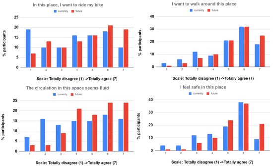 The first part of the survey provides information about the realism of the virtual representation of the studied area. For this, we asked participants to evaluate the similarity between the real current situation and the current situation as represented by TwinMotion with respect to four aspects. Figure 6 shows the result of this first part of the study. From the point of view of the global evaluation, the participants seemed to think that the two situations were rather similar, as shown in Table 2 (M = 4.09, SD = 1.50). This allows us to consider the results obtained subsequently as valid. On the other hand, in terms of detail the respondents were more reserved on the similarity from the point of view of green spaces (M = 3.99, SD = 1.81), cycling spaces (M = 3.97, SD = 1.78), and access to platforms (M = 3.91, SD = 1.71). This is evidenced by the dispersion of the scores obtained in Figure 7, Figure 8, Figure 9, Figure 10 and Figure 11. This obliges us to consider the results obtained for certain questions in Parts 2 and 3 with more caution.