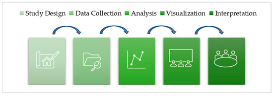 This manuscript is based on bibliometric analysis [60]. The five steps that Zupic & Čater recommended in their research were put into practice [61]. Among them are “study design”, “bibliometric data collection”, “analysis”, “visualization” and “interpretation” (Figure 1).