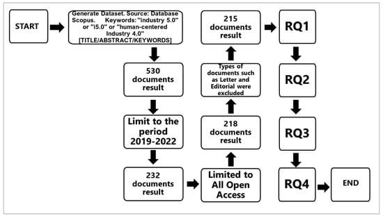 Scopus was used because it is a very complete database, and many of its articles are also simultaneously indexed in other databases. In the Scopus database, the terms “Industry 5.0” or “i5.0” or “human-centered Industry 4.0” were searched in the search field TITLE-ABS-KEY. The rationale for the selection of the three search terms is that, after a review of the literature, they were found to be the most linked to industry 5.0, i.e., they had a high number of co-occurrences. The search returned 530 documents, then was narrowed down to All Open Access, and the search returned 232 records. To obtain recent literature, it was delimited to the period 2019–2022, obtaining 218 records. The types of documents “Letter” and “Editorial” were excluded because we needed research with results, obtaining 215 records. This search includes all countries/territories and all subject areas (Figure 2). The advanced query was as follows: “TITLE-ABS-KEY (“industry 5.0” OR “i5.0” OR “human-centered Industry 4.0”) AND (LIMIT-TO (OA, “all”)) AND (LIMIT-TO (PUBYEAR, 2022) OR LIMIT-TO (PUBYEAR, 2021) OR LIMIT-TO (PUBYEAR, 2020) OR LIMIT-TO (PUBYEAR, 2019)) AND (LIMIT-TO (DOCTYPE, “ar”) OR LIMIT-TO (DOCTYPE, “cp”) OR LIMIT-TO (DOCTYPE, “re”) OR LIMIT-TO (DOCTYPE, “ch”))”.