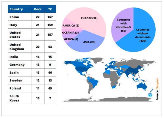 A total of 69 countries are involved in the preparation of the 215 documents, so that a manuscript could be recognized by two or more countries. Figure 4 shows the 10 countries with the most documents and total citations (TC). In first place is China (n = 22; TC: 167) [92,93,94], followed in second place by Italy (n = 21; TC: 159) [63,95,96], in third position and very similar to Italy is the United States (n = 21; TC: 157) [69,97,98], in fourth position is the United Kingdom (n = 20; TC: 93) [72,99,100], fifth place is occupied by India (n = 16; TC: 15) [22,23,84]. In sixth and seventh place are Germany and Spain, with (n = 13; TC: 9) [32,73] and (n = 13; TC: 66) [101,102], respectively, but Spain comes out more favored due to its high TC. In eighth position is Sweden with (n = 12; TC: 13) [47], in ninth place is Poland with (n = 11; TC: 49) [2,62], and South Korea occupies the tenth position with (n = 10; TC: 7) [2,53,62].