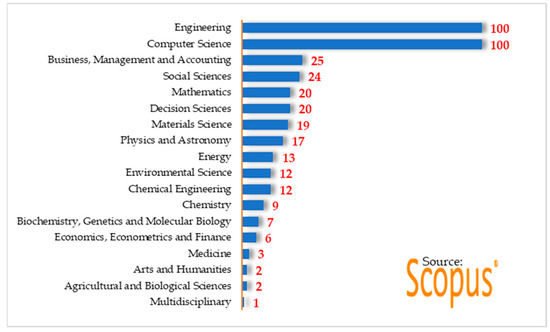 Engineering (n = 100) and Computer Science (n = 100) register documents with a total 400% higher than Business, Management and Accounting (n = 25) and Social Sciences (n = 24). Mathematics and Decision Sciences count the same number of documents individually (n = 20). These are followed by Materials Science (n = 19), which is followed by Physics and Astronomy (n = 17), and Energy (n = 13). Environmental Science and Chemical Engineering also share the same number of manuscripts (n = 12). Chemistry (n = 9), Biochemistry, Genetics and Molecular Biology (n = 7), Economics, Econometrics and Finance (n = 6), Medicine (n = 3), Arts and Humanities (n = 2), and Agricultural and Biological Sciences (n = 2) follow. Finally, in last place is Multidisciplinary (n = 1).