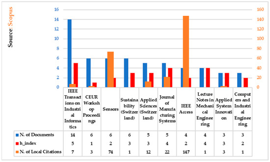 The IEEE Transactions on Industrial Informatics source leads with 14 papers and has been cited by 7 manuscripts, retaining an impact measure of (h_index = 5). CEUR Workshop Proceedings records 6 documents being cited by three manuscripts and its impact measure is (h_index = 1). The six documents indexed by Sensors have managed to be cited by 74 manuscripts, leaving with an impact measure of (h_index = 2). Likewise, the source Sustainability (Switzerland) registers six publications, but is only cited by one manuscript, this source shows a (h_index = 3). Applied Sciences (Switzerland) counts 5 documents cited by 12 manuscripts and its impact measure is (h_index = 3). Journal of Manufacturing Systems also totals 5 documents and is cited in 22 articles, showing a (h_index = 4).