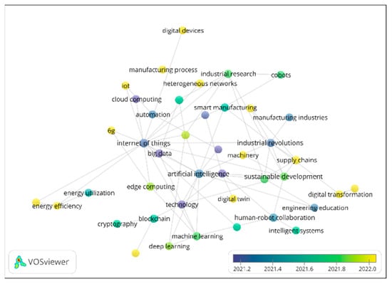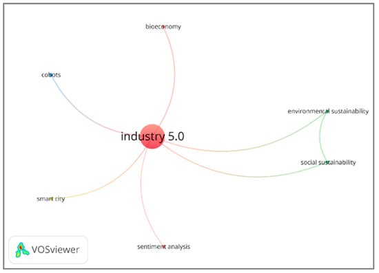 This bibliometric study formulated four research questions (RQ1, RQ2, RQ3, and RQ4) in the Introduction section. For RQ1, Microsoft Excel vertical and horizontal column charts were used to show changes in data during 2019–2022 and/or to illustrate comparisons between items (year, country, subject area, document type, and most relevant sources). For RQ2, a bibliometric methodology known as “keyword co-occurrence analysis” in “overlay display” was used to show the terms that allow us to derive the most influential industry sectors in i5.0. For RQ3, the conceptual structure bibliometric method called Thematic Map was used to show the topics associated with i5.0. For RQ4, the bibliometric-type methodology known as “keyword co-occurrence analysis” under “network visualization” was used in order to show the keywords with minimal co-occurrence, which allows us to indicate the topics associated with i5.0 for future studies.