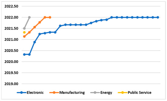 According to Table 2, the interest in industry 5.0 between 2020 and 2022 is noted by the increase in publications in this period. The data resulting from the table is categorized to identify the influential industry sectors in Industry 5.0. During the categorization, the industrial sector identified as All Industry was excluded because it has terms that are valid for the rest of the sectors. In total, four industries were specified, from the most influential to the least influential: Electronic, Manufacturing, Energy, and Public Service.