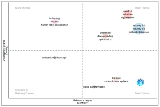 - COVID-19, industries, and digitalization: categorized as “Motor Themes” according to Table 3 and deals with industry 5.0 studies closely related to digitization in the context of COVID-19, i.e., how digitization contributes to improving production processes, increasing productivity, and optimization of energy, resources, and costs [12,41,54,55,111,112,113,114].