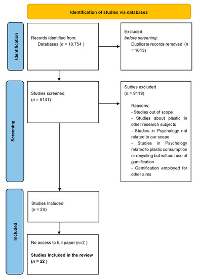 The vast majority of studies had to be excluded as irrelevant to the review’s scope. Specifically, they were either research studies on plastic materials within other subjects related to chemical or mechanical properties and processes (e.g., chemistry, engineering, material science, biology), or about the application of gamification for other aims (e.g., medicine training, education, disabilities), or research studies in psychology but either on unrelated topics (e.g., gambling) or, alternatively, related to plastic but with no use of gamification (e.g., exploration of public attitudes, barriers, knowledge of single-use plastic and re-usable products). The number of appropriate articles was thus reduced to 24. Moreover, two studies were impossible to retrieve from the authors, so the final number of articles reviewed was twenty-two, two of which examine games and installations developed for the same awareness campaign [63,64] (see Figure 1).