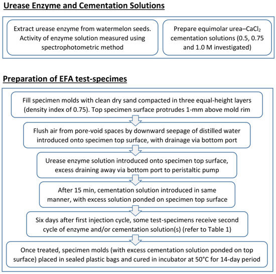 This section describes the sequence of actions in preparing the EICP-treated dense sand specimens for EFA testing (overview of process presented in Figure 2). As described in the Introduction, the authors had identified the application of the EICP technique for mitigating the scouring of dense load-bearing sandy soil deposits as a gap in the research literature. In addition, the precipitated calcite in EICP-treated specimens was analyzed in term of (i) elemental composition and crystal structure using X-ray diffraction (XRD) examination, (ii) morphology and spatial distribution among the sand matrix by SEM examination, and (iii) quantity of precipitated calcite determined using the gravimetric acid-washing method.