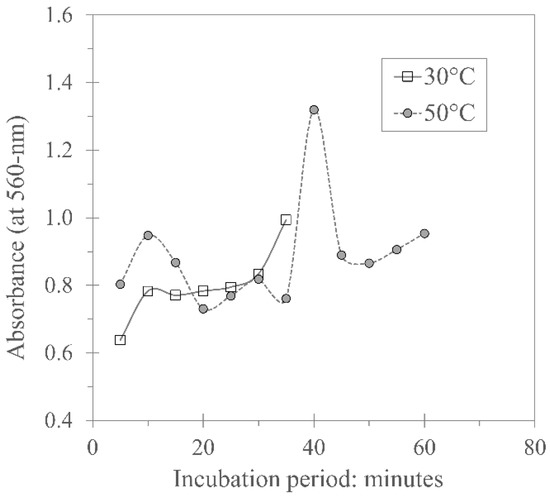 Change in absorbance at 560 nm wavelength with incubation at 30 and 50 °C.