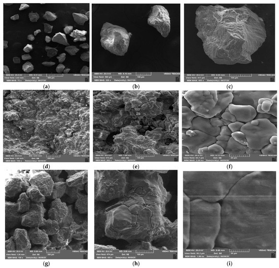 SEM images at different magnification for (a–c) untreated sand and EICP-treated sand using protocol C (d–f) and protocol J (g–i). Refer to Table 1 for summaries of these treatment protocols.