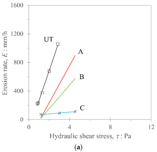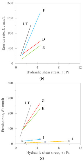 The experimental results for all 10 EICP treatment protocols investigated are plotted in Figure 10 as erosion rate (E) versus hydraulic shear stress (τ) acting at the water–sand interface. The E and τ magnitudes were computed as follows